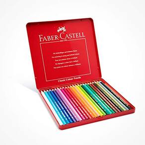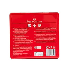 Zestaw 24 szesciokatnych kredek Faber-Castell zamknietych w eleganckim, metalowym opakowaniu.