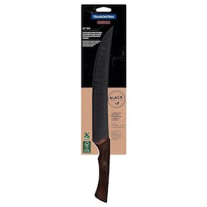 Faca para Carne Tramontina Churrasco Black com Lâmina em Aço Inox Escurecido e Cabo de Madeira 10 Com a faca para carne Tramontina Churrasco Black com lâmina em aço inox escurecido e cabo de madeira 10 polegadas ficou muito mais prático servir as melhores carnes no seu churrasco e com a garantia de um corte de alta qualidade. Produzida com lâmina de aço inox escurecido com excelente afiação, ela é ideal para cortes maiores. Sua lâmina conta com sulcos que minimiza o seu atrito com a carne. O cabo em madeira com rebites proporciona um manuseio muito mais firme e confortável, além de um estilo diferenciado.