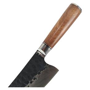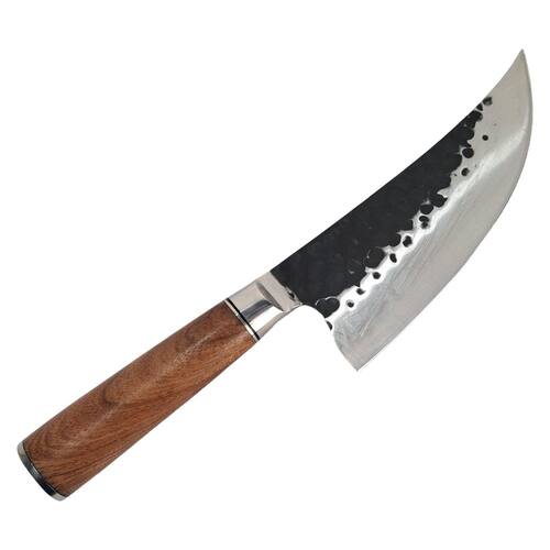 A faca possui um cabo de madeira e uma lâmina de aço inoxidável com marcas decorativas. Essa faca é versátil e adequada para uma variedade de tarefas na cozinha. Com seu cabo confortável e lâmina afiada, ela proporciona um manuseio preciso e seguro.