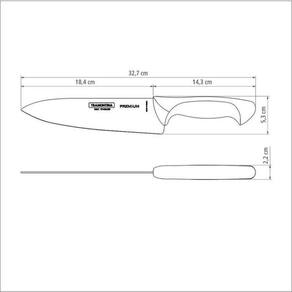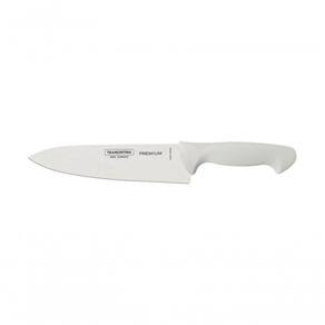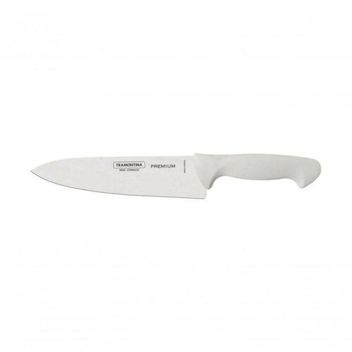 Faca Chef Tramontina Premium Com Lâmina Em Aço Inox E Cabo De Polipropileno Branco 8" As facas da linha Premium Tramontina tem lâmina de aço inoxidável e cabo anatômico, tornado seu uso diário fácil e prático.- Linha PREMIUM. Recomendações de Uso: Antes do uso: Antes de utilizar o , remova as eventuais etiquetas e lave-o com água quente e de uso:Durante a lavagem use somente esponja macia, outros tipos de produtos, como palha de aço, poderão riscar ou prejudicar o brilho do aço inox. Enxágue bem a peça a fim de remover totalmente os resíduos dos produtos de limpeza, que por serem abrasivos, podem danificar o inox. Após a lavagem enxugue a faca, pois as substâncias químicas contidas na água poderão causar manchas. Sempre que possível use água quente, pois renova o brilho do talher. Evite o das peças com superfícies quentes, pois podem provocar a descoloração do produto. Quando usar a máquina de lavar louça, recomendamos retirar o talher logo que tenha terminado o ciclo enxaguar, a fim de que os mesmos sejam secados manualmente.- Tenha cuidado ao Manusear produtos cortantes e perfurantes e mantenha-os fora do alcance de crianças.- Foto meramente ilustrativa.- Embalagem blister. Informações Adicionais:
