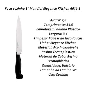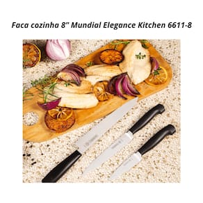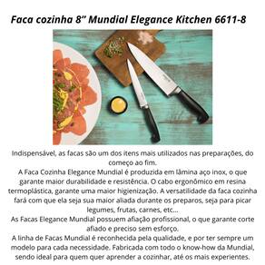 A Faca Cozinha Elegance Mundial é produzida em lâmina aço inox, o que garante maior durabilidade e resistência. O cabo ergonômico em resina termoplástica, garante uma maior higienização. A versatilidade da faca cozinha fará com que ela seja sua maior aliada durante os preparos, seja para picar legumes, frutas, carnes, etc...