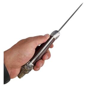 A Faca Full Tang para Camping e Churrasco é robusta e funcional, com lâmina decorada em alto-relevo e cabo de madeira com acabamento em formato de cabeça de lobo. Ideal para atividades ao ar livre ou churrascos, combina elegância, durabilidade e conforto, sendo perfeita para cortes precisos e uso prolongado.