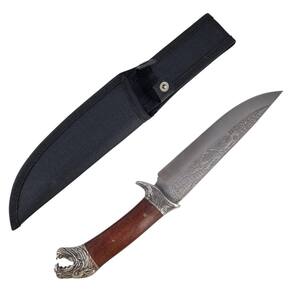 Tipo: Faca Full Tang Material da Lâmina: Aço decorado em alto-relevo Material do Cabo: Madeira com acabamento em cabeça de lobo Comprimento Total: 33 cm Comprimento da Lâmina: 18 cm espessura: 4 mm Comprimento do Cabo: 14 cm Peso: 400 g Uso: Camping, churrasco e decoração