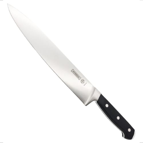 Faca Mundial 10 polegada Inox Profissional O ingrediente que não podia falta para suas cozinha!A faca dos grandes Chefes agora na sua mão, cortar legumes, carnes, peixes, frutos do mar, verduras e frutas nunca mais será a mesma coisa!Faca leve e afiada que garante agilidade e durabilidade do fio de corte. Desenvolvida para uso intenso e cotidiano, projetada em estilo clássico com cabo anatômico e matérias-primas certificados para atender as normas sanitárias e necessidades da cozinha profissional.Com monobloco totalmente forjado (Full Tang), Lâmina em aço inox temperado e ângulo de afiação 30º, e cabo em Polipropileno preto esse projeto apresenta o melhor da cutelaria para a suas mãos.Características :Comprimento Total: 40 cmComprimento da lâmina: 25,5 cm (10 polegadas)Comprimento do Cabo: 14,5 cmBainha plástica: Incluso junto a facaÂngulo do Fio: 30 GrausMaterial Lâmina: Aço InoxMaterial Cabo: Polipropileno PretoFabricante Marca: Mundial FacasPeso: 250 gAplicação :Corte de legumes, carnes, peixes, frutos do mar, verduras e frutasIndicação de Uso :Profissional, Alunos de Gastronomia, entusiastas, Amadores, Chefes de cozinha, auxiliares de cozinha, churrasco, churrascaria, açougue e etc.