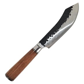 A faca possui um cabo de madeira e uma lâmina de aço inoxidável com marcas decorativas.