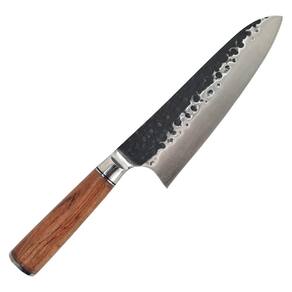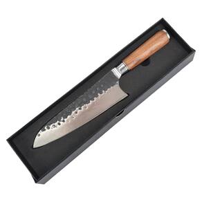 A faca possui um cabo de madeira e uma lâmina de aço inoxidável com marcas decorativas. Essa faca é versátil e adequada para uma variedade de tarefas na cozinha. Com seu cabo confortável e lâmina afiada, ela proporciona um manuseio preciso e seguro.