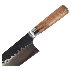A faca possui um cabo de madeira e uma lâmina de aço inoxidável com marcas decorativas. Essa faca é versátil e adequada para uma variedade de tarefas na cozinha. Com seu cabo confortável e lâmina afiada, ela proporciona um manuseio preciso e seguro.