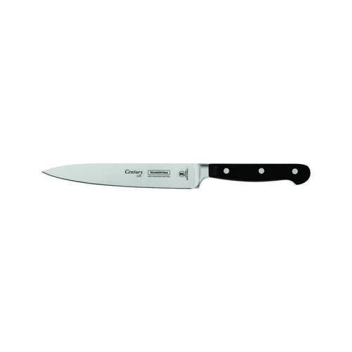 A beleza e o sabor de um prato começa na escolha dos ingredientes e na sua preparação. Com a faca tramontina para cozinha 6 polegadas com lâmina em aço inox com cabo de policarbonato e fibra de vidro ficará ainda mais simples de executar aquela receita incrível. A faca é da linha century, traz o utensílio ideal para o uso intenso. Produzida com lâmina em aço inox, com cabo em policarbonato com fibra de vidro. Além disso, recebe tratamento térmico composto por têmpera aquecimento da lâmina , sub-zero resfriamento de -50° c a -196° c e revenimento aumento da flexibilidade do aço especial , proporcionando vida longa da lâmina. Para tornar o manuseio ainda mais seguro e confortável, o cabo é anatômico e ergonômico. A faca tramontina para cozinha reúne todas as características essenciais para proporcionar um dia a dia mais prazeroso na cozinha, além de funcional e prático. Certificação nsf - os produtos da linha century são certificados pela national sanitation foundation nsf , organização reconhecida como a autoridade internacional em segurança alimentar e práticas de higiene. Especificações técnicas Peso: 100g Dimensões produto compr. X larg. X alt. : 27,4 x 2,5 x 1,3 cm A lâmina forjada de aço inox especial garante um fio com maior durabilidade e precisão; A lâmina possui tratamento térmico diferenciado, composto por têmpera, sub-zero e revenimento; E conta com dureza da lâmina de 55 e 58 hrc, que garante maior resistência do fio e precisão no corte; O cabo de policarbonato reforçado com fibra de vidro garante alta durabilidade, equilíbrio e segurança; O cabo ergonômico proporciona maior segurança, equilíbrio e conforto na hora do corte Pode ir à máquina de lavar louças facilitando seu dia a dia. Conteúdo da embalagem 01 faca cozinha uso geral aço inox tramontina century 6 polegadas 24010/106 Uso seguro e adequado: Antes da primeira utilização, lave bem a peça e seque-a. Tenha cuidado ao manusear produtos cortantes e perfurantes e mantenha-os fora do alcance de crianças. Para maior durabilidade dos produtos, recomenda-se secar bem antes de guardar, mesmo após lavagem em máquina. Para descarte dos produtos e embalagens siga as orientações de reciclagem vigentes. 25 anos contra defeitos de fabricação Todas as informações acima são especificadas de acordo com o fabricante; Fotos meramente ilustrativas; Ean: 7891112005723