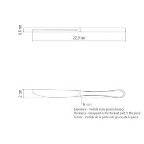 Totalmente feita de aço inox, altamente durável, mantém suas características , preservando a beleza, a higiene e a durabilidade do material. Faca totalmente temperada, que garante maior durabilidade no fio de corte e maior resistência à corrosão, e por suas características de temperabilidade, não risca as porcelanas. O cabo da faca se adapta melhor a palma da mão. Possui equilíbrio harmônico entre o cabo e a lâmina. Acabamento em alto brilho. Pode ser lavada diariamente namáquina de lavar louças.