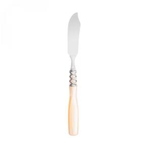 O jogo de 6 facas para peixe da Linha Arianna da Bugatti é composto por um anel cromado trançado inspirado no famoso fio de Ariadne que lhe dá o nome, e um elegante cabo de madrepérola em acrílico colorido.