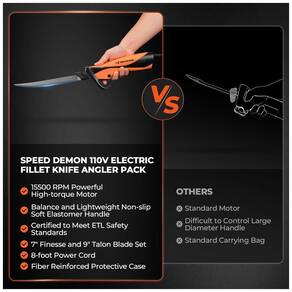 O Facão Elétrico KastKing Speed Demon 110v possui um motor AC potente de alto torque com 15500 rpm, permitindo cortes eficientes e precisos em carnes e ossos. Seu design equilibrado e ergonômico proporciona manuseio fácil, com um cabo de elastômero macio antiderrapante que reduz a fadiga durante o uso prolongado. Certificado pela ETL, garante máxima segurança e proteção térmica. As lâminas de titânio resistentes à corrosão garantem durabilidade e desempenho de alto nível. Inclui dois conjuntos de lâminas de aço inoxidável,atendendo a diversas necessidades de corte. Acompanha acessórios práticos, como cabo , estojo resistente à água e zíper para armazenamento e transporte fácil.