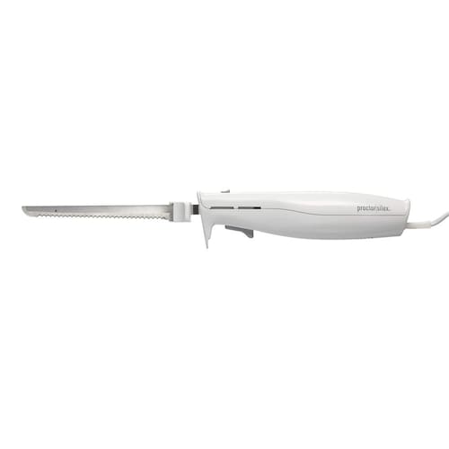 Proctor Silex Faca elétrica de fatia fácil para esculpir carnes, aves, pão, espuma de artesanato e muito mais, leve com aderência contornada, branca - Ótimo para fatiar carnes e pães. A faca elétrica é a faca perfeita para esculpir peru. Fatia sem esforço presunto, peru, assados e uma variedade de carnes. Também é ótimo para fatiar uniformemente pão artesanal, caseiro e outros tipos de pão. - Fatie rapidamente e uniformemente. As lâminas alternativas da faca elétrica são serrilhadas e feitas de aço inoxidável durável, dando a você o controle de precisão para cortar rápida e uniformemente toda vez que você fatiar. - Fácil de segurar. A faca elétrica é leve e tem uma aderência ergonômica e contornada à mão que é fácil de segurar. - Esculpe carnes grandes sem esforço e muito mais. O cabo extra longo de 152 cm oferece muito alcance para esculpir carnes grandes e para cortar espuma e outros materiais para artesanato e projetos de bricolage. - Controle de gatilho fácil de usar. Ligue a faca simplesmente deslizando o gatilho. Solte o gatilho para parar a faca
