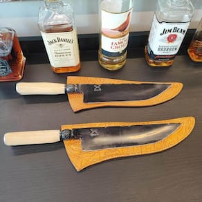 - Por ser produzida de forma artesanal, cada faca se torna única e exclusiva, pois cabo e bainha poderão ter tonalidades e marcações diferentes, além de pequenas variações de medidas.