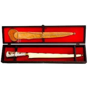 • 1 Faca 1 Bainha em couro cru, costurada a mão 1 Registro de propriedade 1 Manual de recomendação de uso
