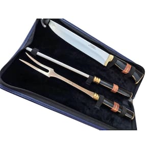 CJ CH 3 Conjunto 3 Peças Cabo Variado Conjunto modelo churrasco cabo variado CJ - CH 3 disponível em tamanho único de 8 polegadas em aço inox , produzido com a mais clássica modelagem de lâmina, tendo a espessura de 3 mm. Acompanha faca, chaira e garfo, o cabo é produzido com material natural de acordo com o a disponibilidade de . Não acompanha bainha, pois o mesmo é enviado em estojo. Medidas aproximadas: Faca - Lâmina 20,5 cm / Cabo 12,5cm / Total 33,0 cm Garfo - Lâmina 20,5 cm / Cabo 12,0 cm / Total 32,5 cm CH 8 - Lâmina 20,5 cm / Cabo 13,0 cm/ Total 33,5 cm