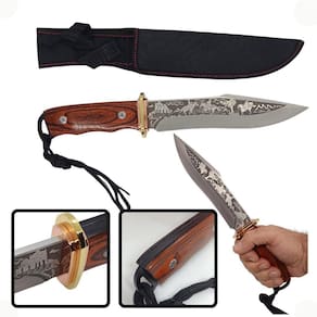 Peso da faca: 375 gramas; Comprimento total da faca: 32,5 cm; Comprimento da lâmina: 19 cm - 7,5 polegadas; Largura da lâmina: 3,6 cm; Espessura da lâmina: 3 mm; Comprimento do cabo: 13,5 cm; Material da lâmina: aço inox; Material do cabo: madeira; Cor da lâmina: prata desenhada; Estrutura da faca: full tang monobloco - empunhadura formada diretamente na placa de aço da faca; Formato da lâmina: clip point;