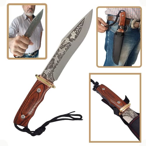 Peso da faca: 375 gramas; Comprimento total da faca: 32,5 cm; Comprimento da lâmina: 19 cm - 7,5 polegadas; Largura da lâmina: 3,6 cm; Espessura da lâmina: 3 mm; Comprimento do cabo: 13,5 cm; Material da lâmina: aço inox; Material do cabo: madeira; Cor da lâmina: prata desenhada; Estrutura da faca: full tang monobloco - empunhadura formada diretamente na placa de aço da faca; Formato da lâmina: clip point;