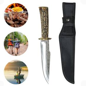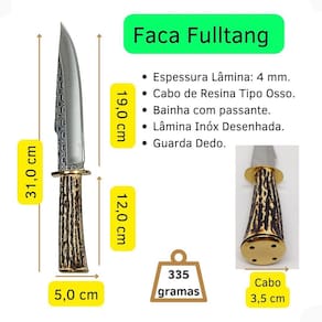 Peso da faca: 335 gramas; Comprimento total da faca: 31,0 cm; Comprimento da lâmina: 19,0 cm - 7,5 polegadas; Largura da lâmina: 3,5 cm; Espessura da lâmina: 4,0 mm; Comprimento do cabo: 12,0 cm; Material da lâmina: aço inox; Material do cabo: resina imitando osso; Cor da lâmina: prata; Formato da lâmina: clip point;