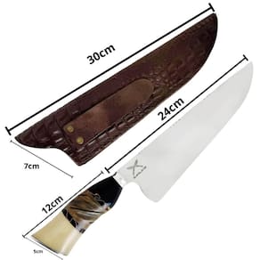 Dimensões da faca com bainha: 39cm (C) x 2,5cm (L) x 7,5cm (A);