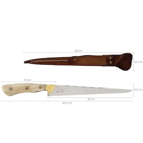 Garantia: vitalícia / Peso: 365g / Ref: 12109CERVO12 Dimensões da faca com bainha: 44cm (C) x 2,5cm (L) x 6,5cm (A); Dimensões da faca: 42,5cm (C) x 2cm (L) x 3,5cm (A); Dimensões da bainha: 36cm (C) x 1,5cm (L) x 6,5cm (A); Dimensões da lâmina: espessura: 4mm / polegadas: 12" / comprimento: 30cm; Lâmina: full tang com mosqueado no dorso.