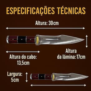 Especificações: .Comprimento total: 31 cm .Comprimento do punho: 10,5 cm .Comprimento da lâmina: 17,5 cm .Largura da lâmina: 3,5 cm .Espessura da lâmina: 4 mm .Peso aproximado: 359 g