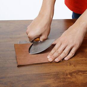 Faca meia lua Bronc-Steel fabricada em aço com cabo de madeira. Utilizada para corte e acabamento em couro.
