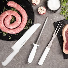 Esta faca Mundial açougueiro da linha Masterline é a protagonista da cozinha de quem ama preparar suas receitas! Sua lâmina de 10 polegadas é produzida em aço inox e possui fio de corte de alta durabilidade, devido ao tratamento térmico aplicado à lâmina. Seu cabo anatômico é em polipropileno branco, e proporciona um manuseio mais seguro e confortável. Além de tudo, é fácil de limpar e pode ir à máquina de lavar louças. Uma faca Mundial de qualidade e com um design perfeito para quem gosta de fazer bonito todos os dias!
