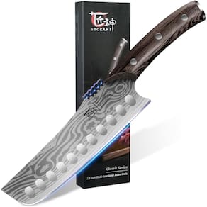 A faca Nakiri SYOKAMI é uma ferramenta de cozinha notável que combina precisão, segurança e durabilidade. Esta faca é projetada para tornar sua experiência culinária mais eficiente e agradável. Uma das características de destaque da faca Nakiri é sua capacidade de cortar fibra vegetal com um único corte. Sua lâmina fina e reta tem poder de corte preciso, o que ajuda a manter os ingredientes em forma e reduz a perda de nutrientes. Se você estiver lidando com cenoura, repolho ou cebola, esta faca pode lidar com grandes quantidades de vegetais sem esforço. É a companhia perfeita para preparar saladas do dia a dia, pratos vegetarianos e refeições com baixo teor de gordura. Projetada para profissionais culinários, a faca Nakiri permite a preparação de alimentos a granel em velocidade incomparável enquanto minimiza a fadiga. Em uma cozinha doméstica, elimina o incômodo de trocar constantemente as ferramentas, tornando o cozimento diário um processo perfeito. Pode lidar facilmente com peles resistentes e separar ingredientes pegajosos com precisão cirúrgica. A segurança é uma prioridade com esta faca. O design cuidadoso e protegido evita que a mão deslize em direção à lâmina. Esta estrutura especial entre a lâmina e o cabo não é apenas uma combinação perfeita de estética artesã, mas também garante segurança para usuários destros e canhotos. Você pode fatiar com confiança alimentos úmidos como tomates sem se preocupar. A consideração antiderrapante é outro ótimo aspecto. A adição de elementos de dentes de engrenagem contemporâneos e um cabo de madeira wenge absorvente garantem uma aderência estável, mesmo quando sua mão ou a alça estão molhadas. Isso dá a você uma sensação de segurança e facilidade de operação, especialmente em uma cozinha movimentada. Em termos de durabilidade e desempenho, a faca Nakiri é precisamente forjada a partir de lâminas de aço alemão de alto carbono importadas. As bordas são polidas à mão de 14 a 16 graus de cada lado e têm uma dureza Rockwell de 56+. É precisamente temperado e resistente a manchas, facilitando a limpeza. O tang completo forjado de precisão de peça única com uma alça wenge tripla rebitada oferece resistência confiável e um peso agradável. As facas de cozinha SYOKAMI também são um excelente presente. Feitas com precisão e durabilidade, elas são feitas para durar uma vida inteira. E com 100% de satisfação ou garantia de devolução do dinheiro, você pode experimentá-lo sem riscos. Você certamente vai adorar esta faca Nakiri excepcional para todas as suas necessidades culinárias.