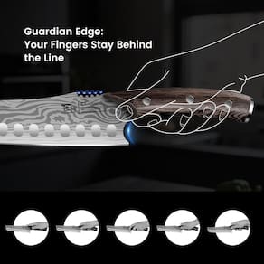 - 1 GUARDA, 0 COMPROMISSO NA SEGURANÇA — O design cuidadoso e protegido evita que a mão deslize em direção à lâmina, como uma estrutura especial entre a lâmina e o cabo, é a combinação perfeita de estética artesanal e mecanismo de segurança adequado para usuários canhotos e destros, até mesmo alimentos úmidos como tomates, podem ser fatiados com confiança