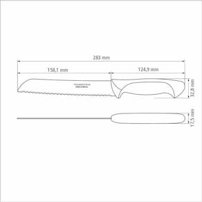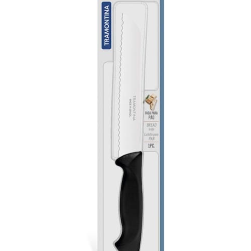 Faca Pão Lâmina Inox/Cabo Polipropileno Preto 7 23042107Para um café da manhã delicioso, nada como aquele pão caseiro quentinho, não é mesmo E para te auxiliar na hora de saborear essa delícia, conte com o Faca para Pão Tramontina Usual com Lâmina em Aço Inox e Cabo de Polipropileno Preto 7 polegadas. Desenvolvida para uso no dia a dia, a faca é resistente e conta com lâmina em aço inox e cabo de polipropileno. Seu manuseio ainda é muito confortável e ela ainda agregará um toque de modernidade à sua mesa, devido a cor preta. Com a Tramontina, você tem as melhores facas para completar sua cozinha, sua casa e sua vidaDiferenciaisA lâmina serrilhada corta sem amassar.A lâmina de aço inox têm maior durabilidade do fio devido ao tratamento térmico. O cabo de polipropileno possui maior resistência e durabilidade. Pode ir à máquina de lavar louças facilitando seu dia a dia.Orientações geraisAntes da primeira utilização, lave bem a peça e seque-a. Produto cortante e perfurante: tenha cuidado ao manusear e mantenha fora do alcance das crianças. Para maior durabilidade do produto recomenda-se secar bem antes de guardar, mesmo após lavagem em máquina. Recomenda-se o uso de tábuas de polipropileno ou madeira da tramontina para maior durabilidade do fio da faca. Não é indicado o uso da faca para o corte de alimentos congelados. Para descarte dos produtos e embalagens siga as orientações de reciclagem vigentes.Faca para pão 7 usualReferência: 23042107