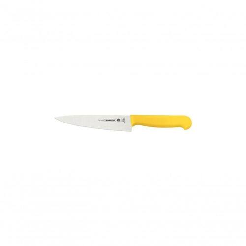 Emaço inox especial DIN , é a faca ideal para uso ável e com excelente corte, possui cabo de polipropileno comproteção antibacteriana, que inibe o crescimento de bactérias e higiene e na preparação de alimentos. - Linha MASTER - Cabo na cor AMARELO