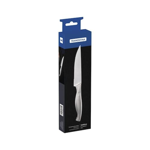 Faca Para Churrasco E Frutas Tramontina Sublime Em Aço Inox 5 Polegada Faca para Churrasco e Frutas Tramontina Sublime em Aço Inox 5 O preparo das suas refeições terá mais qualidade e eficiência, com a Faca para Churrasco e Frutas Tramontina Sublime em Aço Inox 5 polegadas. Desenvolvida com um design moderno e com linhas exclusivas, tem sua produção totalmente em aço inox e sua lâmina conta com fio serrilhado, que a torna ideal para o corte de carnes cozinhas e frutas. Uma faca diferenciada, que deixará seu dia a dia na cozinha muito mais prático!