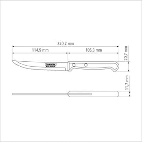 O encontro com as pessoas queridas vai ficar muito mais gostoso com a Faca para Churrasco e Frutas Tramontina Ultracorte com Lâmina em Aço Inox e Cabo de Polipropileno Preto 5 Polegadas da Linha Ultracorte. Projetada para o corte de carnes assadas e frutas deliciosas, a faca possui fio serrilhado que facilita o corte. Produzida com lâmina de 5 polegadas em aço inox, recebe tratamento térmico que dá mais durabilidade ao fio. O cabo em polipropileno na cor preta é resistente e possui proteção antimicrobiana que inibe o crescimento de fungos e bactérias. Pode ser levada à máquina de lavar louças. É um talher essencial para sua cozinha. Orientações Com fio serrilhado, é ideal para o corte de carnes cozidas e frutas.A lâmina de aço inox têm maior durabilidade do fio devido ao tratamento térmico. O cabo de polipropileno possui maior resistência e durabilidade. E conta com proteção antimicrobiana, que inibe e reduz o crescimento de bactérias e fungos proporcionando benefícios em higiene e redução de microorganismos que causam contaminação. Esta ação dura por toda a vida útil dos produtos, mas não elimina a necessidade de limpeza.Rebites de alumínio.Pode ir à máquina de lavar louças facilitando seu dia a dia. Observações Antes da primeira utilização, lave bem a peça e seque-a. Produto cortante e perfurante: tenha cuidado ao manusear e mantenha fora do alcance das crianças. Para maior durabilidade do produto recomenda-se secar bem antes de guardar, mesmo após lavagem em máquina. Recomenda-se o uso de tábuas de polipropileno ou madeira da Tramontina para maior durabilidade do fio da faca. Não é indicado o uso da faca para o corte de alimentos congelados. Para descarte dos produtos e embalagens siga as orientações de reciclagem vigentes. Características Gerais EAN13 7891112068094 DUN14 17891112068091 NCM 8211.91.00 Peso Líquido 0,0290 kg. Peso Bruto 0,0370 kg. Metragem 0,000215 m³. Dimensões Embalagem (Compr. X Larg. X Alt.) 13x 60x 275 mm. Dimensões Produto (Compr. X Larg. X Alt.) 220x 21x 12 mm. Cor 1 000000 Hexa
