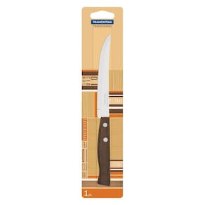 Se você precisa de um talher para deixar seu churrasco mais bonito e saboroso, a Faca para Churrasco Tramontina Tradicional com Lâmina em Aço Inox e Cabo de Madeira Natural 5 polegadas é ideal para você. O fio possui grande durabilidade e resistência por ser produzido com lâmina em aço inox e receber tratamento térmico. Além disso, apresenta um cabo de madeira natural combinando com ambientes rústicos e oferecendo o charme que seus momentos merecem. Eficiência e qualidade é com os produtos Tramontina! Orientações Com fio liso, é ideal para o corte de carnes cozidas.A lâmina de aço inox tem maior durabilidade do fio devido ao tratamento térmico. O cabo é de madeira natural. Rebites de alumínio. Observações Antes da primeira utilização, lave bem a peça e seque-a. Produto cortante e perfurante: tenha cuidado ao manusear e mantenha fora do alcance das crianças. Para maior durabilidade do produto recomenda-se secar bem antes de guardar. Para descarte dos produtos e embalagens siga as orientações de reciclagem vigentes. Características Gerais EAN13 7891112003866 DUN14 17891112003863 NCM 8211.91.00 Peso Líquido 0,0250 kg. Peso Bruto 0,0400 kg. Metragem 0,000175 m³. Dimensões Embalagem (Compr. X Larg. X Alt.) 11x 60x 265 mm. Dimensões Produto (Compr. X Larg. X Alt.) 209x 19x 10 mm.