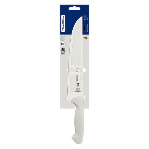 Faca para Cozinha 10 Premium Branco Aço Inox Tramontina A faca para cozinha Tramontina Premium com lâmina em aço inox e cabo de polipropileno branco 10 polegadas é a escolha perfeita para profissionais e amadores na área gastronômica. Criada para cortar carnes cruas, assadas ou cozidas, ela possui características que fazem dela a melhor escolha para sua cozinha. Com design moderno, ela é produzida com lâmina em aço inox de 10 polegadas e cabo de polipropileno branco. A lâmina apresenta alta durabilidade no fio de corte devido ao tratamento térmico aplicado e o cabo, anatômico e texturizado, garante maior conforto e segurança durante o uso. Muito prática, é super fácil de limpar e pode ainda ser lavada na máquina de lavar louças. Uma faca para quem preza em ter o melhor na cozinha Informações Gerais Com lâmina rígida e estreita, facilita o corte de diversos alimentos. A lâmina de aço inox têm durabilidade do fio devido ao tratamento térmico. O cabo de polipropileno possui maior resistência e durabilidade. Pode ir à máquina de lavar louças facilitando seu dia a dia. Recomendações de uso Antes da primeira utilização, lave bem a peça e seque-a. Produto cortante e perfurante: tenha cuidado ao manusear e mantenha fora do alcance das crianças. Para maior durabilidade do produto recomenda-se secar bem antes de guardar, mesmo após lavagem em máquina. Recomenda-se o uso de tábuas de polipropileno ou madeira da Tramontina para maior durabilidade do fio da faca. Não é indicado o uso da faca para o corte de alimentos congelados. Mantenha sempre sua faca afiada utilizando os afiadores da Tramontina. Para descarte dos produtos e embalagens siga as orientações de reciclagem vigentes. Especificações Marca: Tramontina Modelo: Faca P/Cozinha 10 Premium Branco Linha: Premium Cor: Branco Material da Lâmica: Aço Inox Material do Cabo: Polipropileno Compatível com Lava-Louças: Sim Contém: 01 Unidade Marca: Não Informado Ean: 7895073103283