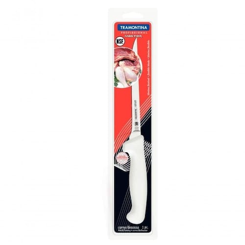 Faca Para Desossar 7 Tramontina Com Lâmina De Aço Inox E Cabo De Polipropileno Branco Emaço inox especial DIN , é a faca ideal para uso ável e com excelente corte, possui cabo de polipropileno comproteção antibacteriana, que inibe o crescimento de bactérias e higiene e na preparação de alimentos. - Linha MASTER Recomendações de Uso: Antes do uso: Antes de utilizar o , remova as eventuais etiquetas e lave-o com água quente e de uso:Durante a lavagem use somente esponja macia, outros tipos de produtos, como palha de aço, poderão riscar ou prejudicar o brilho do aço inox. Enxágue bem a peça a fim de remover totalmente os resíduos dos produtos de limpeza, que por serem abrasivos, podem danificar o inox. Após a lavagem enxugue a faca, pois as substâncias químicas contidas na água poderão causar manchas. Sempre que possível use água quente, pois renova o brilho do talher. Evite o das peças com superfícies quentes, pois podem provocar a descoloração do produto. Quando usar a máquina de lavar louça, recomendamos retirar o talher logo que tenha terminado o ciclo enxaguar, a fim de que os mesmos sejam secados manualmente.- Tenha cuidado ao Manusear produtos cortantes e perfurantes e mantenha-os fora do alcance de crianças.- Foto meramente ilustrativa. Informações Adicionais: