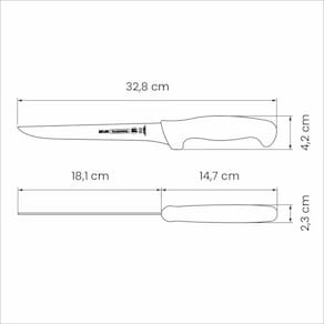 Ideal para separar a carne dos ossos e tirar a gordura.Lâmina resistente, afiada e durável.Lâmina de aço inox especial tratado termicamente com processo sub-zero, garantindo níveis de dureza média de 56 HRc.Desbaste cônico na espessura adequada para cada aplicação, garantindo precisão e durabilidade no fio de corte.Cabo anatômico, higiênico e seguro.Cabo em polipropileno texturizado, oferecendo maior conforto e segurança no manuseio.Cabo injetado diretamente sobre a espiga que garante perfeita fixação e evita a retenção de resíduos.Cabo com proteção antimicrobiana que inibem o crescimento de fungos e bactérias, proporcionando benefícios em higiene e redução de microorganismos que causam contaminação.