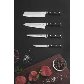 Faca para Fatiar e Picar Tramontina Century com Lâmina em Aço Inox e Cabo de Policarbonato com Fibra de Vidro 7" v Informações Gerais Ideal para cortar, fatiar e picar. A lâmina forjada de aço inox especial garante um fio com maior durabilidade e precisão. A lâmina possui tratamento térmico diferenciado, composto por têmpera, sub-zero e revenimento. E conta com dureza da lâmina de 55 e 58 HRC, que garante maior resistência do fio e precisão no corte. O cabo de policarbonato reforçado com fibra de vidro garante alta durabilidade, equilíbrio e segurança. O cabo ergonômico proporciona maior segurança, equilíbrio e conforto na hora do corte. Pode ir à máquina de lavar louças facilitando seu dia a dia.