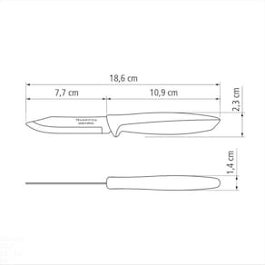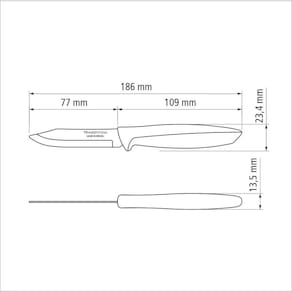 Para levar mais conforto e praticidade para sua cozinha, a Faca para Legumes e Frutas Tramontina Plenus com Lâmina em Aço Inox e Cabo de Polipropileno Preto 3 polegadas da Linha Plenus é a melhor escolha. Produzida com lâmina em aço inox e cabo em polipropileno na cor preta, ela auxilia você na preparação dos seus melhores pratos. Com três polegadas, ela é ideal para cortar, descascar e fazer cortes delicados em legumes e frutas. Ela é uma peça indispensável na sua cozinha! Orientações Ideal para cortar, descascar e fazer cortes delicados.A lâmina de aço inox têm maior durabilidade do fio devido ao tratamento térmico. O cabo de polipropileno possui maior resistência e durabilidade. Pode ir à máquina de lavar louças facilitando seu dia a dia. Características Gerais EAN13 7891112224971 DUN14 17891112224978 NCM 8211.92.10 Peso Líquido 0,0250 kg. Peso Bruto 0,0350 kg. Metragem 0,000208 m³. Dimensões Embalagem (Compr. X Larg. X Alt.) 15x 55x 252 mm. Dimensões Produto (Compr. X Larg. X Alt.) 186x 23x 14 mm. Cor 1 000000 Hexa Observações Antes da primeira utilização, lave bem a peça e seque-a. Produto cortante e perfurante: tenha cuidado ao manusear e mantenha fora do alcance das crianças. Para maior durabilidade do produto recomenda-se secar bem antes de guardar, mesmo após lavagem em máquina. Recomenda-se o uso de tábuas de polipropileno ou madeira da Tramontina para maior durabilidade do fio da faca. Não é indicado o uso da faca para o corte de alimentos congelados. Mantenha sempre sua faca afiada utilizando os afiadores da Tramontina.Para descarte dos produtos e embalagens siga as orientações de reciclagem vigentes.