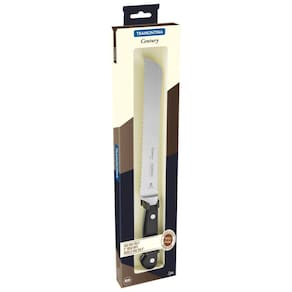 Faca para Pão Tramontina Century com Lâmina em Aço Inox e Cabo de Policarbonato e Fibra de Vidro 8" Nada mais gostoso do que acordar e tomar aquele café da manhã saboroso com um pão novinho. A Faca para Pão Tramontina Century com Lâmina em Aço Inox e Cabo de Policarbonato e Fibra de Vidro 8 polegadas tornará esses momentos ainda mais prazerosos. Ela foi desenvolvida especialmente para o uso intenso, garantindo durabilidade e qualidade em todas as ocasiões. A Faca para Pão da linha Century é produzida com lâmina em aço inox, com cabo em policarbonato com fibra de vidro. Além disso, recebe tratamento térmico composto por têmpera (aquecimento da lâmina), sub-zero (resfriamento de -50° C a -196° C ) e revenimento (aumento da flexibilidade do aço especial), proporcionando vida longa da lâmina. Para tornar o manuseio ainda mais seguro e confortável, o cabo é anatômico e ergonômico. Suas características únicas irão proporcionar uma excelente performance e um corte prático. Com a Tramontina você transforma o seu dia a dia. Informações Gerais A lâmina serrilhada corta sem amassar o seu pão. A lâmina forjada de aço inox especial garante um fio com maior durabilidade e precisão. A lâmina possui tratamento térmico diferenciado, composto por têmpera, sub-zero e revenimento. E conta com dureza da lâmina de 55 e 58 HRC, que garante maior resistência do fio e precisão no corte. O cabo de policarbonato reforçado com fibra de vidro garante alta durabilidade, equilíbrio e segurança. O cabo ergonômico proporciona maior segurança, equilíbrio e conforto na hora do corte. Pode ir à máquina de lavar louças facilitando seu dia a dia.