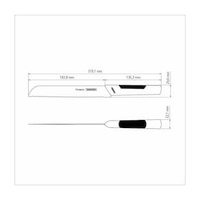 A lâmina serrilhada corta sem amassar. Lâmina de aço inox com revestimento na cor preta com maior durabilidade do fio devido ao tratamento térmico. Conta com maior capacidade de deslizamento reduzindo o esforço durante o corte. Cabo de polipropileno com textura especial. Material atóxico com proteção antimicrobiana que inibe o crescimento de fungos e bactérias.