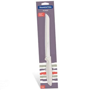 Tenha sempre por perto produtos que lembram momentos especiais. Com a Faca para Pão Tramontina Plenus com Lâmina em Aço Inox e Cabo de Polipropileno Off White 8 polegadas da Linha Plenus, o cheiro de pão quentinho vai perfumar toda sua casa. Perfeita para cortar diferentes pães sem amassá-lo, ela tem produtos que garantem qualidade e durabilidade. Produzida com lâmina de 8 polegadas em aço inox, ela ainda possui um estiloso cabo em polipropileno off white. É uma peça que embeleza sua cozinha e ainda traz conforto e bem-estar para o seu dia a dia. Orientações A lâmina serrilhada corta sem amassar.A lâmina de aço inox têm maior durabilidade do fio devido ao tratamento térmico. O cabo de polipropileno possui maior resistência e durabilidade. Pode ir à máquina de lavar louças facilitando seu dia a dia. Características Gerais EAN13 7891112225145 DUN14 17891112225142 NCM 8211.92.10 Peso Líquido 0,0746 kg. Peso Bruto 0,0990 kg. Metragem 0,000645 m³. Dimensões Embalagem (Compr. X Larg. X Alt.) 22x 77x 381 mm. Dimensões Produto (Compr. X Larg. X Alt.) 322x 34x 18 mm. Cor 1 D9D9D6 Hexa Observações Antes da primeira utilização, lave bem a peça e seque-a. Produto cortante e perfurante: tenha cuidado ao manusear e mantenha fora do alcance das crianças. Para maior durabilidade do produto recomenda-se secar bem antes de guardar, mesmo após lavagem em máquina. Recomenda-se o uso de tábuas de polipropileno ou madeira da Tramontina para maior durabilidade do fio da faca. Não é indicado o uso da faca para o corte de alimentos congelados. Para descarte dos produtos e embalagens siga as orientações de reciclagem vigentes.