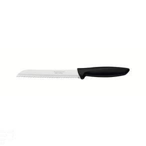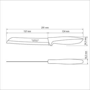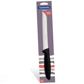 Depois de preparar um pão quentinho, nada melhor que servi-lo com carinho e cuidado. Com a Faca para Pão Tramontina Plenus com Lâmina em Aço Inox e Cabo de Polipropileno Preto 7 polegadas da Linha Plenus, a hora de servir vai ficar ainda mais gostosa. Com lâmina de 7 polegadas produzida em aço inox, ela possui um confortável cabo em polipropileno na cor preta. É uma faca prática que auxilia você no dia a dia a cortar seu pãozinho sem amassá-lo. Tramontina sempre pensando no melhor para você! Orientações A lâmina serrilhada corta sem amassar.A lâmina de aço inox têm maior durabilidade do fio devido ao tratamento térmico. O cabo de polipropileno possui maior resistência e durabilidade. Pode ir à máquina de lavar louças facilitando seu dia a dia. Características Gerais EAN13 7891112225077 DUN14 17891112225074 NCM 8211.92.10 Peso Líquido 0,0700 kg. Peso Bruto 0,0800 kg. Metragem 0,000400 m³. Dimensões Embalagem (Compr. X Larg. X Alt.) 18x 65x 342 mm. Dimensões Produto (Compr. X Larg. X Alt.) 291x 34x 18 mm. Cor 1 000000 Hexa Observações Antes da primeira utilização, lave bem a peça e seque-a. Produto cortante e perfurante: tenha cuidado ao manusear e mantenha fora do alcance das crianças. Para maior durabilidade do produto recomenda-se secar bem antes de guardar, mesmo após lavagem em máquina. Recomenda-se o uso de tábuas de polipropileno ou madeira da Tramontina para maior durabilidade do fio da faca. Não é indicado o uso da faca para o corte de alimentos congelados. Para descarte dos produtos e embalagens siga as orientações de reciclagem vigentes.