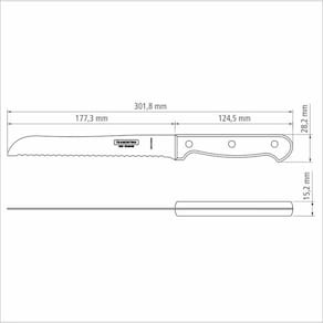 Um item que não pode faltar na sua cozinha é a Faca para Pão Tramontina Polywood com Lâmina em Aço Inox e Cabo de Madeira Castanho 7 polegadas da Linha Polywood. Ela irá proporcionar dias ainda mais prazerosos e práticos. Com uma lâmina em aço inox, que recebe tratamento térmico, e fio serrilhado que facilita o corte do pão sem amassá-lo, ela garante toda a resistência que só a Tramontina pode oferecer. O seu cabo é produzido em madeira tratada Polywood, ou seja, ele permite um manuseio seguro e confortável, sem deixar de lado a durabilidade. Além de contar com resistência à impactos e altas temperaturas. Orientações A lâmina de aço inox têm maior durabilidade do fio devido ao tratamento térmico. O cabo de madeira tratada Polywood é resistentes à impactos e alta temperaturas garantindo maior resistência e durabilidade. Rebites de alumínio. Pode ir à máquina de lavar louças facilitando seu dia a dia. Características Gerais EAN13 7891112108325 DUN14 17891112108322 NCM 8211.92.10 Peso Líquido 0,0950 kg. Peso Bruto 0,1180 kg. Metragem 0,000362 m³. Dimensões Embalagem (Compr. X Larg. X Alt.) 17x 65x 328 mm. Dimensões Produto (Compr. X Larg. X Alt.) 302x 28x 15 mm. Observações Tenha cuidado ao manusear produto cortante e perfurante e mantenha-o fora do alcance das crianças. Para maior durabilidade do produto recomenda-se secar bem antes de guardar, mesmo após lavagem em máquina. Para descarte dos produtos e embalagens siga as orientações de reciclagem vigentes.
