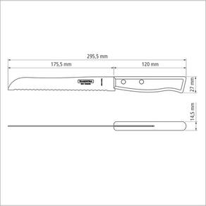 A Faca para Pão Tramontina Tradicional com Lâmina em Aço Inox e Cabo em Madeira Natural 7 polegadas é a peça ideal para fatiar aquele pão delicioso e quentinho feito em casa sem amassá-lo. Produzida com lâmina em aço inox, a peça proporcionará mais durabilidade e qualidade aos seus convidados. A resistência e versatilidade do produto está tanto na lâmina quanto no cabo, que é desenvolvido em madeira natural dando aquele toque rústico à peça. Qualidade e versatilidade é com a Tramontina. Orientações A lâmina serrilhada corta sem amassar.Lâmina de aço inox com maior durabilidade do fio devido ao tratamento térmico. Cabo de madeira natural. Rebites de alumínio. Observações Antes da primeira utilização, lave bem a peça e seque-a. Produto cortante e perfurante: tenha cuidado ao manusear e mantenha fora do alcance das crianças. Para maior durabilidade do produto recomenda-se secar bem antes de guardar. Recomenda-se o uso de tábuas de polipropileno ou madeira da Tramontina para maior durabilidade do fio da faca. Não é indicado o uso da faca para o corte de alimentos congelados. Para descarte dos produtos e embalagens siga as orientações de reciclagem vigentes. Características Gerais EAN13 7891112002548 DUN14 17891112002545 NCM 8211.92.10 Peso Líquido 0,0700 kg. Peso Bruto 0,0930 kg. Metragem 0,000388 m³. Dimensões Embalagem (Compr. X Larg. X Alt.) 15x 68x 380 mm. Dimensões Produto (Compr. X Larg. X Alt.) 295x 27x 15 mm.