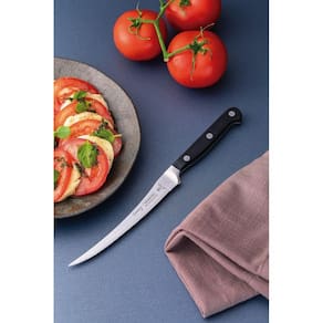 Eficiência e delicadeza no corte, você encontra com a Faca para Tomate Tramontina Century com Lâmina de Aço Inox com Cabo de Policarbonato e Fibra de Vidro Preto 5 polegadas. Ideal para quem busca alta performance na cozinha, ela possui lâmina forjada em aço inox com um fio de corte com maior durabilidade e precisão, que garante o manuseio desse alimento tão delicado, sem o risco de amassá-lo. Com a Tramontina, você encontra os melhores itens para cozinhar com excelência! Orientações Ideal para cortar e fatiar queijos moles e semiduros.A lâmina forjada de aço inox especial garante um fio com maior durabilidade e precisão. A lâmina possui tratamento térmico diferenciado, composto por têmpera, sub-zero e revenimento. E conta com dureza da lâmina de 55 e 58 HRC, que garante maior resistência do fio e precisão no corte. O cabo de policarbonato reforçado com fibra de vidro garante alta durabilidade, equilíbrio e segurança. O cabo ergonômico proporciona maior segurança, equilíbrio e conforto na hora do corte. Pode ir à máquina de lavar louças facilitando seu dia a dia. Observações Antes da primeira utilização, lave bem a peça e seque-a. Produto cortante e perfurante: tenha cuidado ao manusear e mantenha fora do alcance das crianças. Para maior durabilidade do produto recomenda-se secar bem antes de guardar, mesmo após lavagem em máquina. Recomenda-se o uso de tábuas de polipropileno ou madeira da Tramontina para maior durabilidade do fio da faca. Não é indicado o uso da faca para o corte de alimentos congelados. Para descarte dos produtos e embalagens siga as orientações de reciclagem vigentes. Características Gerais EAN13 7891112284395 DUN14 17891112284392 NCM 8211.92.10 Peso Líquido 0,0600 kg. Peso Bruto 0,1250 kg. Metragem 0,000820 m³. Dimensões Embalagem (Compr. X Larg. X Alt.) 93x 28x 315 mm. Dimensões Produto (Compr. X Larg. X Alt.) 238x 20x 11 mm. Cor 1 000000 Hexa