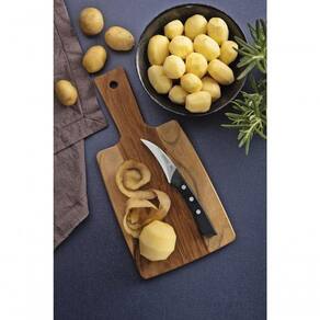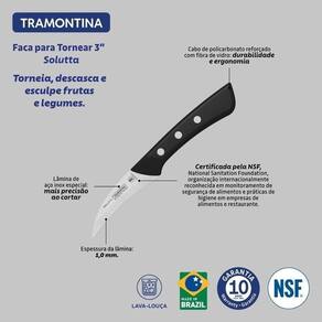 Compacta e precisa, a faca para tornear Tramontina Solutta de 3 polegadas é perfeita para trabalhos detalhados, como descascar e esculpir frutas e legumes. A lâmina em aço inox oferece um fio resistente e duradouro, ideal para cortes curvos e delicados. O cabo em policarbonato preto, reforçado com fibra de vidro, garante firmeza e conforto no manuseio. Certificada pela NSF e com lava-louças, une alimentar e praticidade, sendo indispensável na rotina da cozinha.