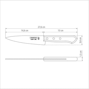A qualidade do seu prato está relacionada com as suas habilidades culinárias, mas também com utensílios adequados e de qualidade. E para garantir isso, a Faca Peixeira Tramontina com Lâmina em Aço Carbono com Cabo de Madeira 6 polegadas é a escolha certa! Uma faca com alto desempenho de corte, pois é produzida com lâmina em aço carbono com acabamento em verniz protetor e tratamento térmico; ela ainda conta com cabo de madeira com rebites de alumínio, que dão um toque rústico à peça e garante mais comodidade na hora da utilização. Uma faca especial com a qualidade Tramontina que você já conhece e confia! Orientações Tradicionalmente chamada de peixeira, se difundiu na cozinha para usos diversos.Lâmina de aço carbono com maior durabilidade e resistência do fio de corte. Cabo de madeira.Rebites de alumínio. Observações Produto cortante e perfurante, tenha cuidado ao manusear e mantenha fora do alcance das crianças.As facas com lâmina de aço carbono se caracterizam por uma maior resistência do fio, o que lhe confere bom poder de corte e são facilmente afiadas. Entretanto essa propriedade do aço carbono dá uma propensão maior à oxidação e descoloração do aço, se não forem tomados alguns cuidados básicos como:Sua faca é uma ferramenta de corte, não a utilize para fins inadequados. Procure mantê-la sempre afiada. Evite procedimentos que possam danificar o fio. Recomendam-se operações de corte sobre uma prancha de madeira ou plástico, que além de proteger as superfícies da sua cozinha, retardam o desgaste do fio da faca. Lave-a após cada utilização com água morna e seque-a imediatamente, evitando assim que a faca seque naturalmente, pois a umidade é a maior inimiga de sua faca carbono.Ao guardar sua faca carbono proteja a lâmina com algum óleo protetivo, o que reduzirá a possibilidade de oxidação. O azeite comestível é uma das alternativas.Recomenda-se o uso de tábuas de polipropileno ou madeira da Tramontina para maior durabilidade do fio da faca.Não é indicado o uso da faca para o corte de alimentos congelados. Mantenha sempre sua faca afiada utilizando os afiadores da Tramontina. Para descarte dos produtos e embalagens siga as orientações de reciclagem vigentes. Características Gerais EAN13 7891112003668 DUN14 17891112003665 NCM 8211.92.10 Peso Líquido 0,0760 kg. Peso Bruto 0,0950 kg. Metragem 0,000269 m³. Dimensões Embalagem (Compr. X Larg. X Alt.) 55x 15x 326 mm. Dimensões Produto (Compr. X Larg. X Alt.) 276x 36x 15 mm.