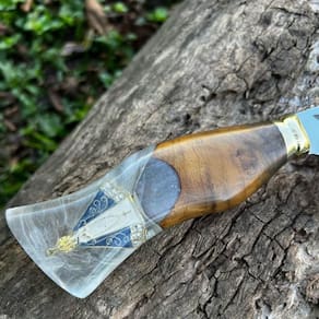Obs.: por ser produzida de forma artesanal, cada faca se torna única e exclusiva. O cabo e a bainha possuem tonalidades, cores e marcações diferentes, além de pequenas variações de medidas.
