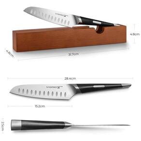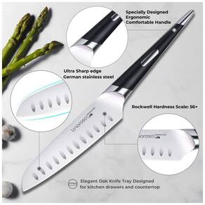 Aço alemão premium A faca japonesa Linoroso com estilo Santoku japonesa é fabricada com aço 1.4116 alemão de alto carbono forjado e habilmente for, um dos melhores materiais de cutelaria culinária do . Por meio de um processo de tratamento térmico a chegar mais a um rápido, a lâmina HRC chegará rapidamente 58. A lâmina de precisão 1.4 resulta em um produto robusto para este cromo, não é firme e resistente à ferragem de precisão Nava é uma Por uma lâmina automática que atende com precisão 11 ângulo por lado nitidez e as máximas. Isso garante ao manipulador um corte uniforme e sem esforço, sempre. Design moderno e moderno Com seu design moderno, elegante e ergonômico, esta cozinha multifuncional é adequada para a maioria das tarefas de corte de cozinha, como picar, picar, cortar ou cortar em cubos. Mais do que mera estética, o material ABS antiderrapante na alça permite segurar a fachada com firmeza, independentemente da umidade, a espiga de aço integrada enquanto permite um controle de controle ou corte. Bandeja elegante para fachadas de carvalho interno cada compra vem com uma caixa de fachadas personalizadas para zenamento de carvalho para o zenamento crescente com uma compra de uma fachada única. A bandeja de bancadas pode facilmente caber nas bancadas da cozinha e pode ser inferior a ser inclinada nas bancadas, pois a caixa da lâmina da cozinha, com bordas para gavetas Marca: Não Informado
